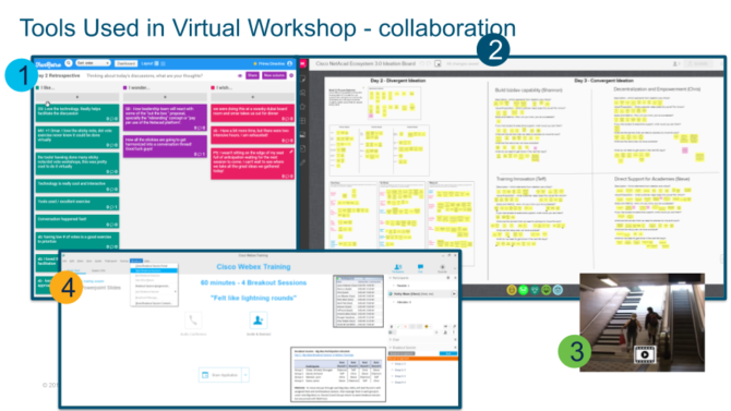 Si facilitar una discusión con un gran grupo de personas en persona es un desafío, hacerlo online es aún más difícil. En nuestro caso decidimos limitar el número de participantes a 10 personas por sesión. A la hora de moderar, mi consejo es que te apoyes en herramientas visuales para que los participantes plasmen sus ideas en primer lugar y así poder pedirles que presenten sus 2 ideas principales. Puedes pedirles hacerlo en papel o usando algunas herramientas que menciono en mi último consejo. Si tienes un grupo numeroso como el nuestro, prueba usar Breakout Rooms en Webex training para crear sub-grupos de discusión pequeños (tres personas cada uno). Esta funcionalidad va muy bien y crear grupos más pequeños te ayudará a incrementar la participación en el taller.