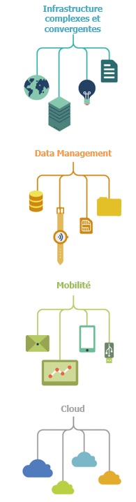 D.FI s’est organisé autour de 4 grandes problématiques (Infrastructures complexes et convergentes, Data Management, Cloud et Mobilité) en constituant des « practices ».