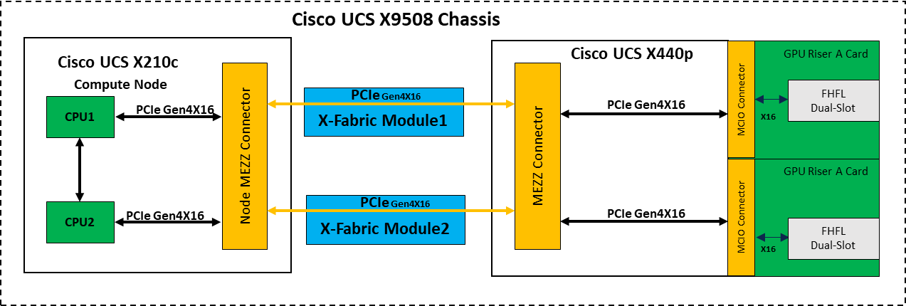 La connectivité entre le serveur X210c-M6 et son module X440p voisin est assurée par le module d’interconnexion X-Fabric X9416 qui se place à l’arrière du châssis et interconnecte directement les serveurs X210c avec les nodes X440p. Le X9416 est basé sur le standard PCIe Gen4. Les possibilités de PCIe Gen4 permettent uniquement d’appairer un X440p avec un seul compute Node X210c. Le schéma ci-dessous illustre la connectivité entre ces deux Nodes.
