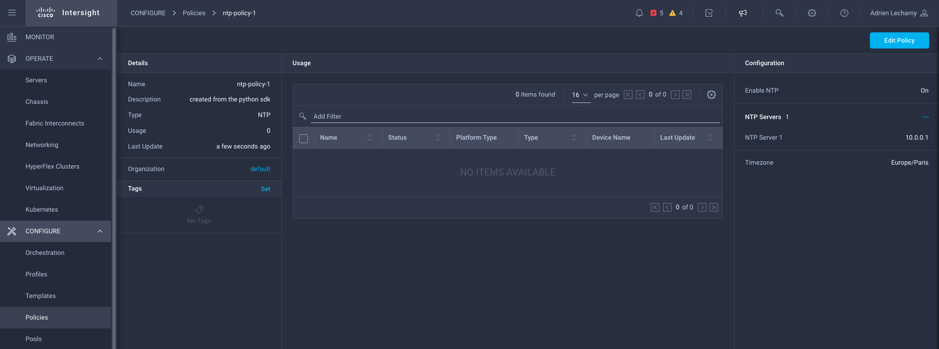 Maintenant, créons un objet avec le SDK Python. Nous souhaitons créer une policy NTP que l’on pourrait par exemple utiliser plus tard dans des Server Profiles.