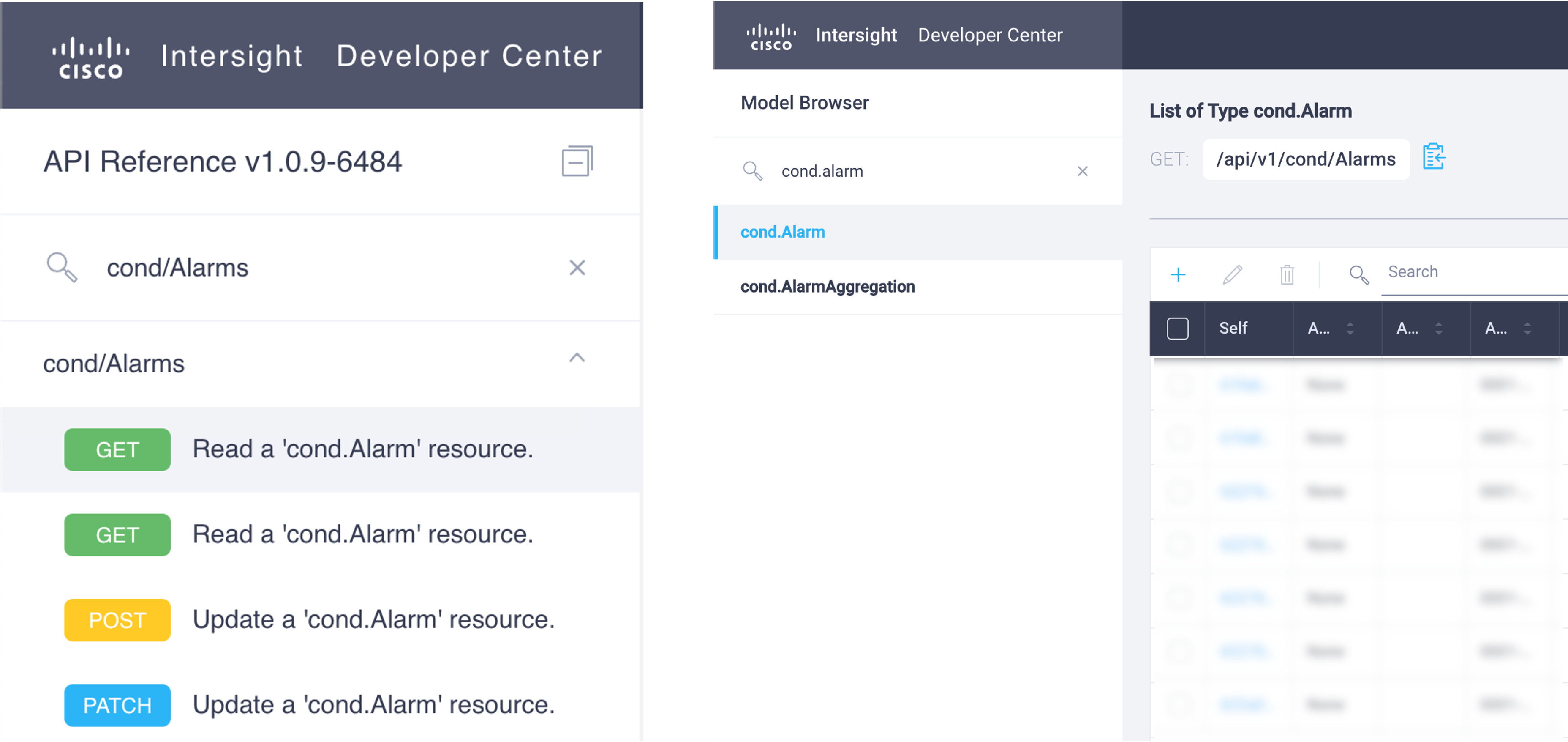 • Alternativement, en utilisant l’API Explorer ou le Model Browser décrits dans le billet de blog précédent, on peut également retrouver des informations sur les objets d’Intersight. Ici, les alarmes sont des ressources de type cond.Alarm, et le module Python à importer est cond_api. La construction ressource_api est toujours la même quel que soit l’objet. Les modules ressource_api comportent les classes RessourceApi et ses méthodes permettant d’interagir avec l’API d’Intersight : lecture, création, modification ou suppression.