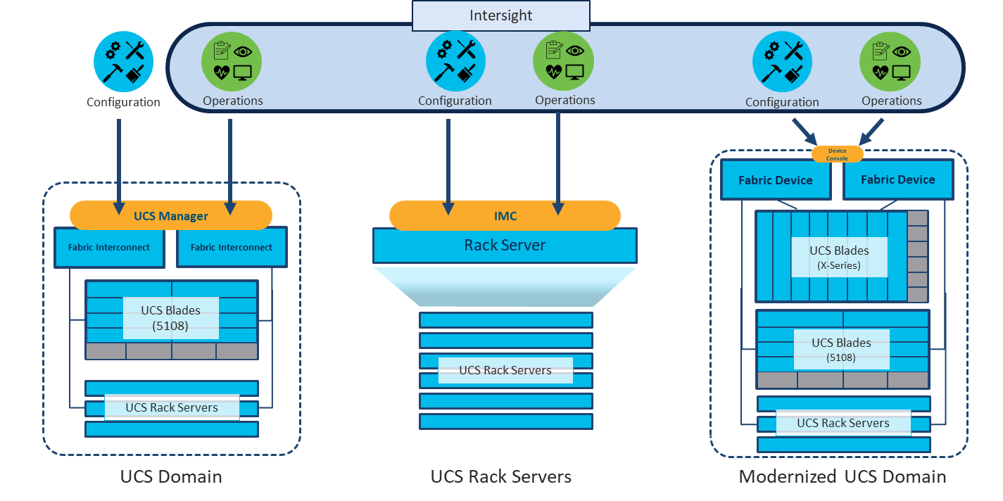Comme illustré ci-dessous, Intersight gère les équipements UCS de 3 manières différentes: