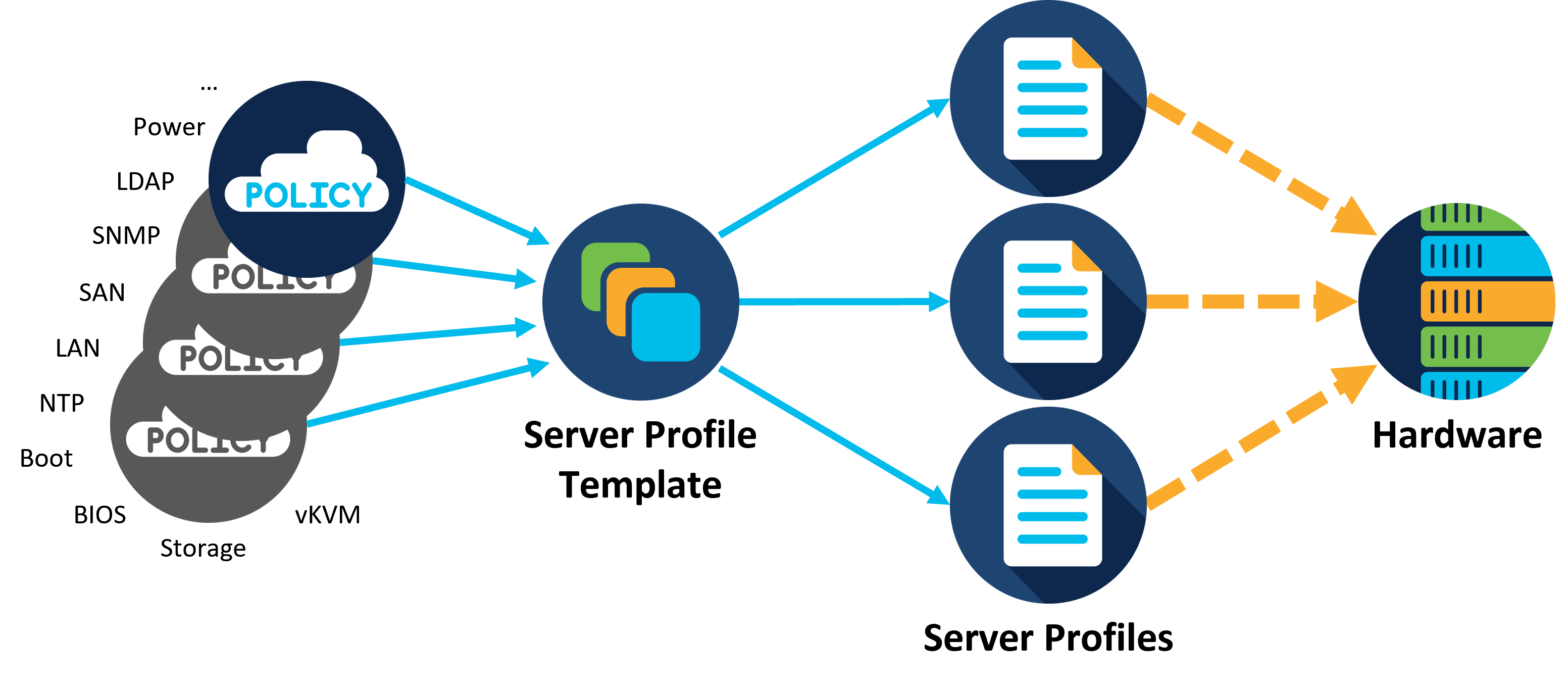 • pour les serveurs: BIOS, Boot order, LAN, SAN, storage, server management, etc …