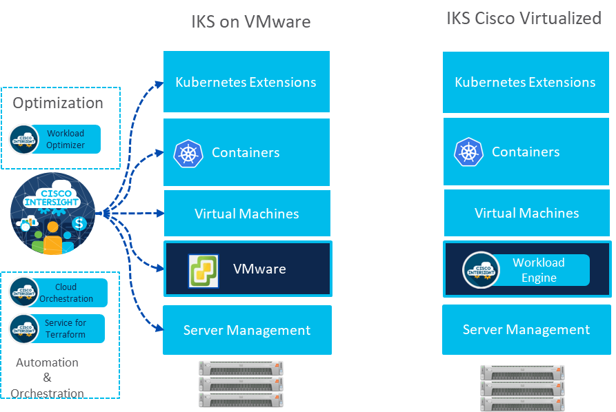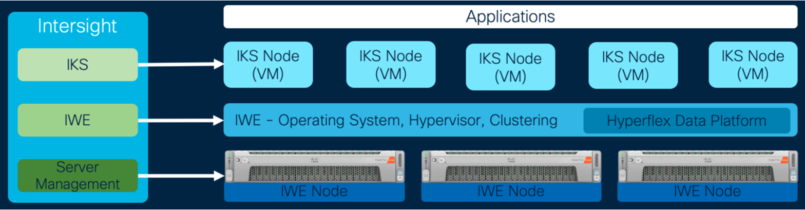 IWE est une des infrastructures sur lesquelles Intersight Kubernetes Services (IKS) peut déployer les nœuds Kubernetes (sous forme de VMs aujourd’hui, et en mode bare-metal dans le futur).
