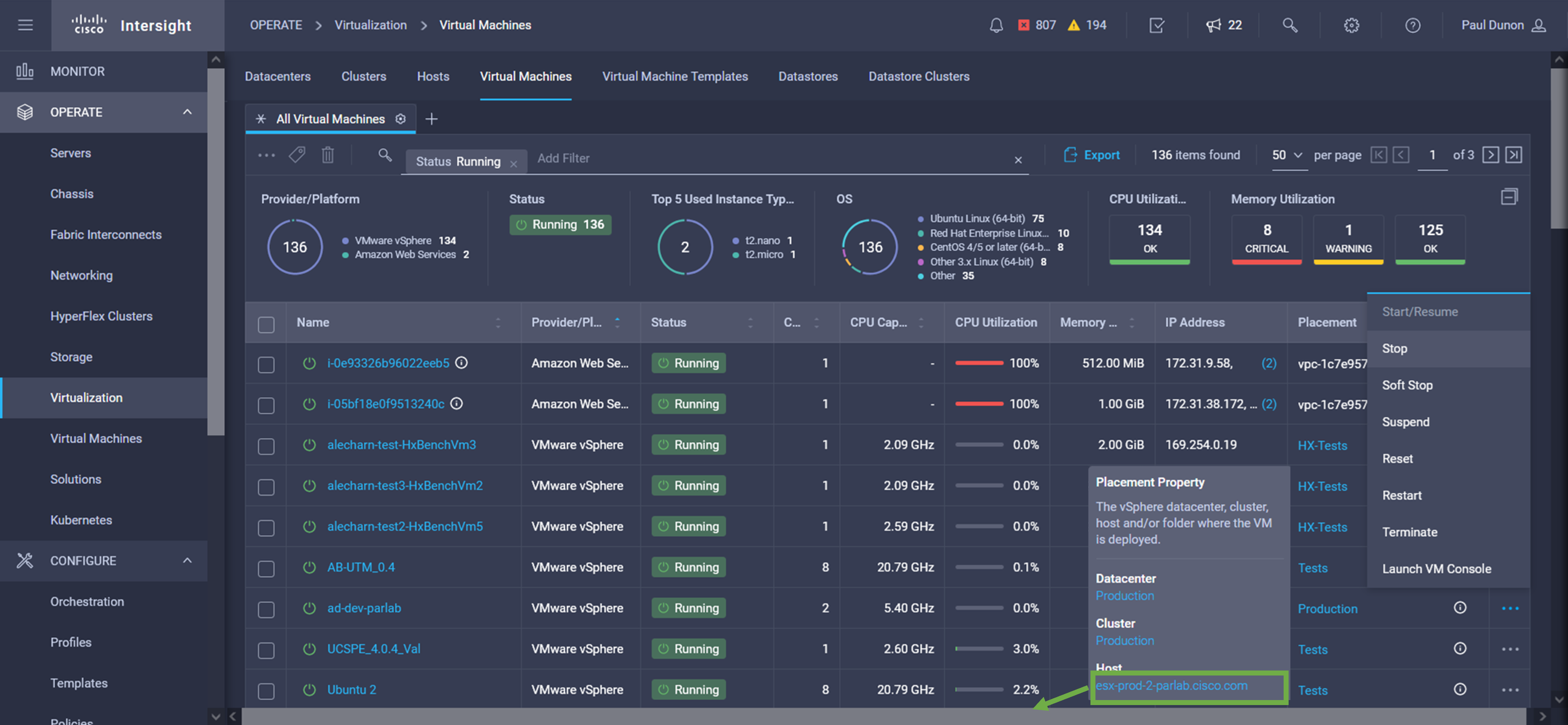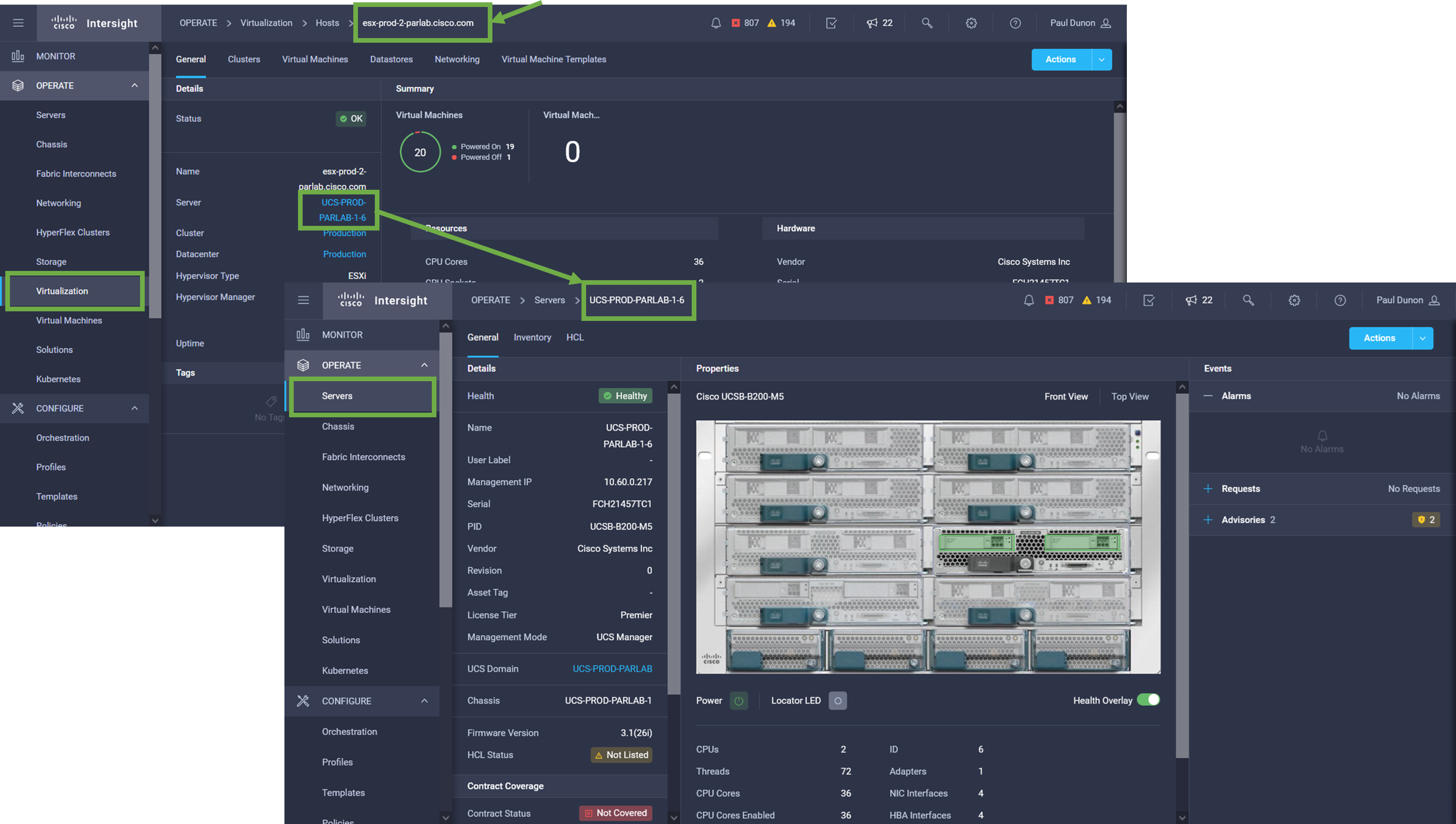- Les Virtual Machines VMware vSphere qui tournent sur l’infrastructure UCS supervisée par le module Intersight Infrastructure Service (IIS), c’est-à-dire les serveurs UCS rack (C-Series), blades (B-Series), serveurs modulaires (X-Series) et HyperFlex.