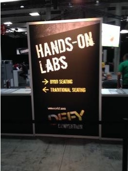 La première chose qui frappe, c’est la super organisation autour des labs. Il y a une zone dédiée aux Hands-on Labs, avec un principe de base : on peut choisir d’utiliser le “Traditional Seating“, qui signifie “utiliser une station mise à disposition par VMware” ou le “BYOD Seating“, qui signifie “utiliser son propre laptop pour accéder aux labs”.