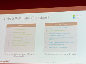 Comme toujours le discours était très pragmatique, rappelant la nécessité d’avancer pas à pas, chaque étape apportant déjà de nombreux bénéfices opérationnels. L’équipe a rappelé à quel point plug-and-play (PNP) sur DNA Center leur permettait de gagner un temps précieux (voir détails ci-dessous si vous arrivez à déchiffrer ma mauvaise photo). Il est bien indiqué qu’ils sont passés de de 480min à 45min pour l’installation complète de 6 équipements.