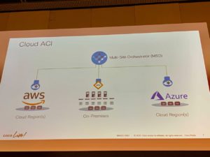 J’ai poursuivi sur un autre breakout un peu plus court “ACI Cloud First” rappelant comment ACI Cloud permet d’homogénéiser le management des plateformes IAAS (AWS et Azure à ce stade) qui utilisent des modèles de données différents. Il devient possible de les adresser exactement de la même manière qu’un infrastructure ACI classique, avec le même modèle de donné que celui utilisé sur votre datacenter on-prem. MSO (Multi-Site Orchestration) va offrir la capacité de piloter l’ensemble de ces déploiements ACI (on-prem ou cloud) d’une manière identique en assurant leur interconnexion. Rien de plus simple avec cette solution d’assurer par exemple une micro-segmentation end-to-end entre tous ces environnements, démo à l’appui.