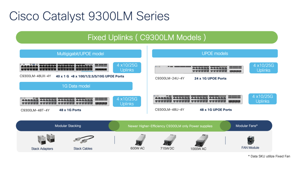 - C9300LM-48U-4Y – 48 ports 10/100/1000 UPOE
