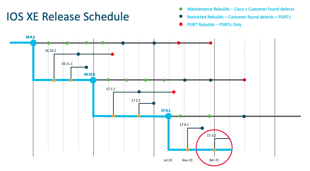 Pour ceux qui ont raté les épisodes précédents, IOS-XE c’est simple ! Un logiciel et un cycle de développement commun pour tout le réseau d’entreprise : switching, routing et wireless. Il y a 3 releases par an à des dates fixes (juillet, novembre et avril), et la version d’été bénéficie d’un statut “Extended Maintenance Release”, ce qui signifie qu’elle va être maintenue plus longtemps avec davantage de rebuilds (corrections de bugs ou de failles de sécurité).