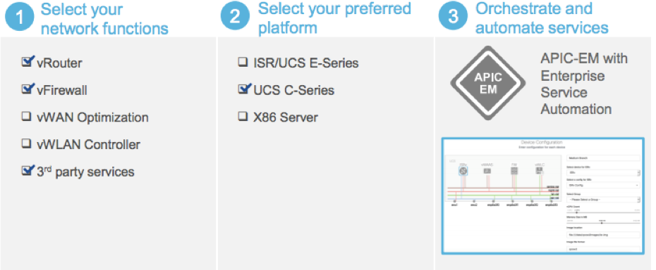 L’hyperviseur NFVIS doit être installé sur l’ENCS afin de pouvoir déployer les fonctions ou les applications en format virtuel. L’orchestration se fait grâce à plusieures solutions : Enterprise Services Automation (ESA,application d’orchestration qui discute avec le contrôleur APIC-EM), Prime (configuration et provisionning d’équipement) et l’APIC-EM. ESA utilise le composant d’APIC-EM Plug & Play qui permet de configurer automatiquement l’équipement.