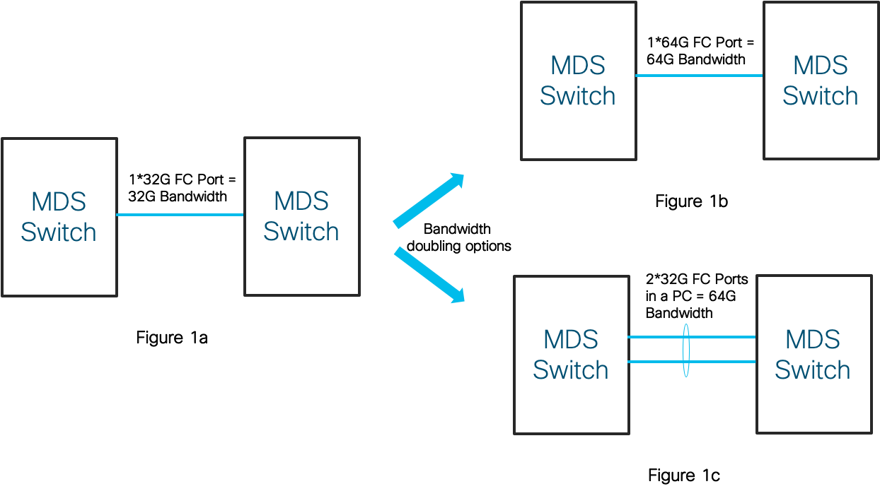 This one should be quite straight forward. When you want to increase bandwidth capacity of an ISL, there are essentially two options: either upgrade the native link capacity to a higher speed or form an aggregate of two or more lower speed links. The FC hardware (especially optics) of the next speed generation is usually significantly higher priced (>2x) than the current generation. It may even require an upgrade of the switch hardware. Hence link aggregation (with PCs) on existing hardware can be significantly cheaper and as effective as single link of higher speed on next-gen hardware. An example of this is shown below in Figure 1. You might wonder what if in Figure 1c it was not a PC? Would that not also be same? Hold on to that question, since its coming up later back to you!