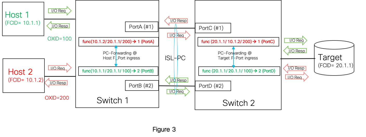 Figure 3 is simple example on how two I/Os from two hosts towards a target would be load balanced. Note that both I/O Request and Response of a given exchange pick the same PC member.