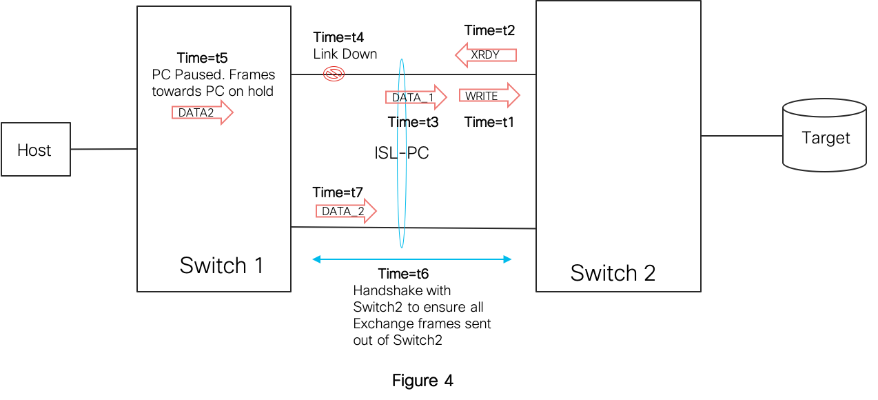 Figure 4 shows operation when a member link goes down at time=t4 in the middle of a Write I/O exchange. While frame loss transiting the link when it went down is inevitable, note how an incoming frame DATA-2 is held in Switch1 till its guaranteed that all previous frames that made it to Switch2 are flushed out from Switch2. The DATA-2 frame is released from Switch-1 only at time=t7.