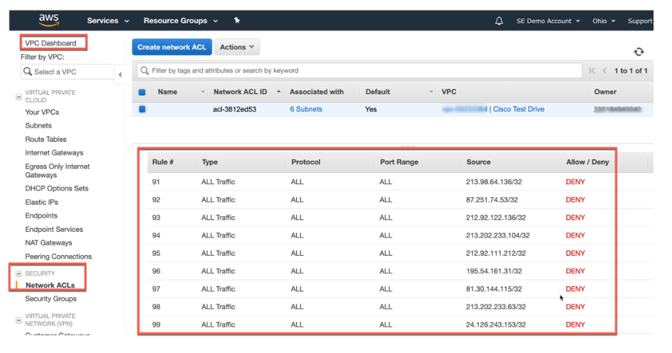Per poter dimostrare queste funzionalità all’interno di Stealthwatch Cloud, abbiamo realizzato un tutorial su come eseguire il ripristino automatico in AWS su un workload che è stato violato inserendo tramite codice di programmazione le ACL di rete VPC (NACL) per bloccare i trasgressori in tempo reale mentre tentano di sfruttare un’istanza EC2 eccessivamente esposta.