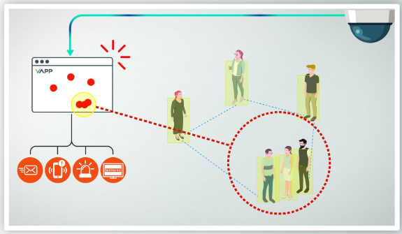 - Se le persone si avvicinano troppo e V-App rileva un assembramento invia subito un allarme.