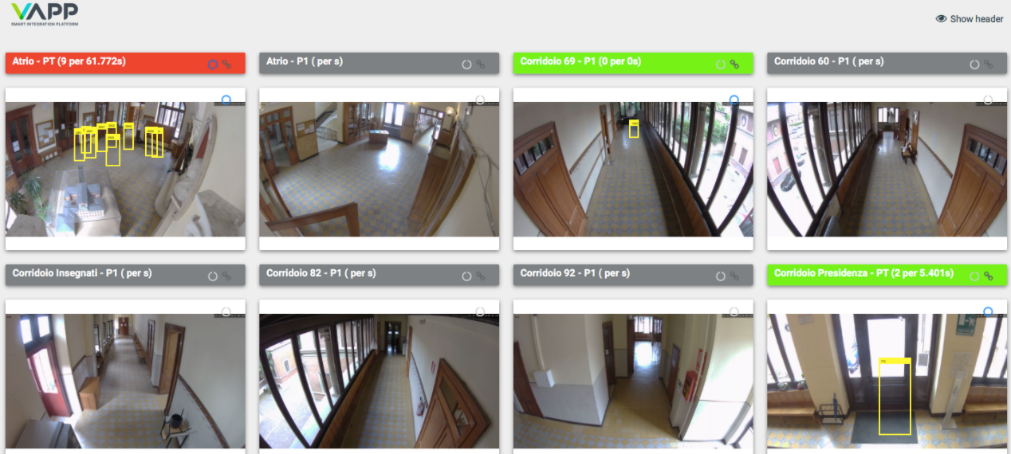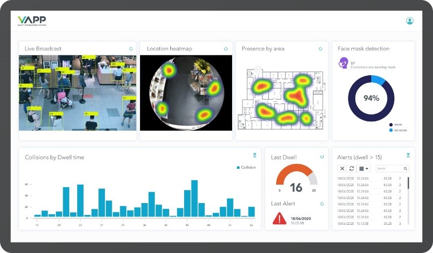 V-App monitora l’occupazione in tempo reale per capire e controllare come il luogo di lavoro può essere utilizzato per fornire un ambiente sicuro e sano in cui lavorare. La concentrazione delle persone è mappata su mappe termiche in tempo reale costruite sopra gli impianti degli uffici per fornire una comprensione intuitiva di ciò che accade negli edifici. Gli allarmi possono essere attivati quando viene raggiunta una soglia di concentrazione o se i dipendenti non mantengono la distanza sociale o non indossano le mascherine.