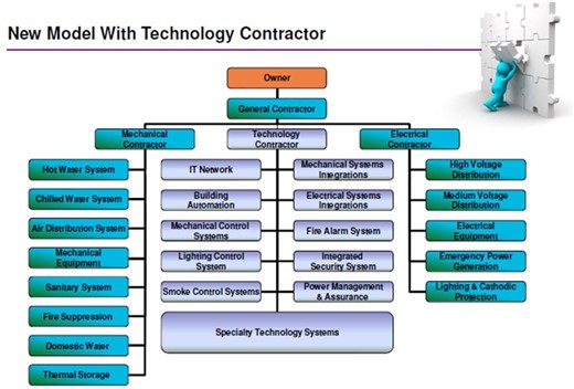 Partiamo dai modelli organizzativi: come si può osservare dalla figura seguente, l’introduzione della figura del “Technology Contractor”, figura distinta dal profilo “Meccanico” e da quello “Elettrico”, introduce un elemento di novità, difficilmente reperibile nelle organizzazioni che si occupano di costruzioni, almeno in Italia.