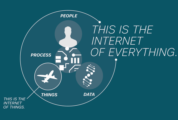 This is The Internet of EverythingIoT(Internet of Things)は、モノがインターネットでつながることです。そして IoE(Internet of Everything)は、IoT を基盤にしてその上に、モノだけでなく、全てのヒト、情報システム(業務プロセスとデータ)がネットワークによってつながることを指します。これにより、これまで分断されていた情報システムが連携して、協調し、お互いが見えるようになります。