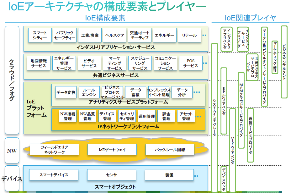 IoEを構成する要素の全体像が示されました。特に M2M、P2P、P2M のプラットフォームの重要性が強調されました。