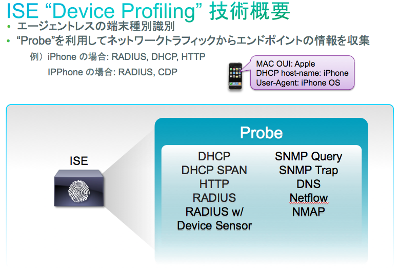 端末がネットワークに接続する際の認証時には、IEEE 802.1x や MAB (Mac Auth Bypass)で得た情報だけでなく、端末から発生するトラフィックを使ってデバイスの種類を見極める(Device Profiling)こともできます 。
