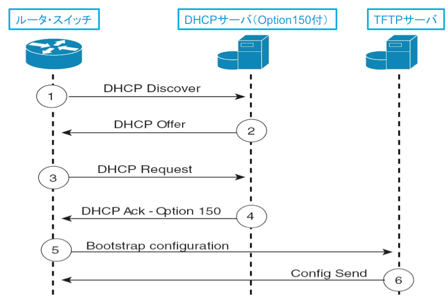 •  設定が何もないIOS装置は、Option 150 で通知されたアドレスに、TFTP で(共通の)設定ファイルを取得しにいく