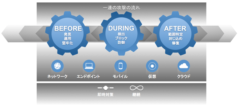 このような状況のなかで必要とされるのは、これまでのポイント イン タイム方式のセキュリティ対策ではなく、次々に現れる脅威にも対応可能な継続的なソリューションです。実際、複雑化・巧妙化する攻撃に対処するためにセキュリティ ソリューション自体が複雑化しており、複数のソリューションを個別に導入していては、断片的な対策になりがちで、連動もしないので管理しにくいということにもなります。