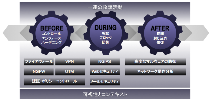 シスコでは、このような攻撃エリアの拡大、巧妙化する攻撃・脅威に対応するため、攻撃の流れ(Before/During/After)に沿って包括的なセキュリティを実現する脅威中心型セキュリティ(Threat Centric Security)モデルを提唱しています。