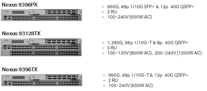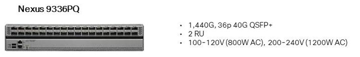- Cisco Nexus 9300 シリーズ:Spine 専用モデルと Leaf 専用モデルがあります。Nexus 9336PQ が Spine 専用モデル、Nexus 9396TX、Nexus 9396PX、Nexus 93128TX が Leaf 用モデルとなります。