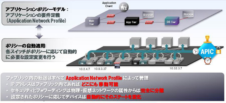 - そのアプリケーション ネットワーク ポリシーに該当するサーバ(物理サーバまたは仮想サーバ)がファブリックに接続されると、Nexus のメモリ上に保持されたポリシーが Nexus のハードウェア レベルで解釈できる設定に転換される
