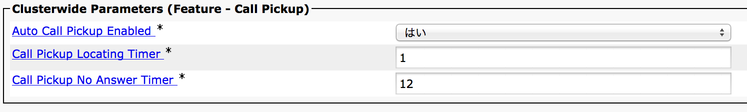 まずは、Auto Call Pickup 機能を設定します。ピックアップ操作をした際、Cisco Unified Communications Manager の標準動作ではまず一度「着信中」になります。そうではなく、ピックアップ操作=応答とする機能が Auto Call Pickup となります。Auto Call Pickup 機能を有効にした状態が日本国内で一般的な企業電話の操作になります。