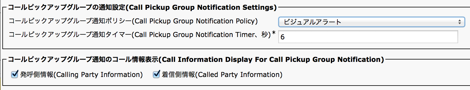 コールピックアップ通知ポリシー:表示での通知または音での通知あるいはその両方を設定