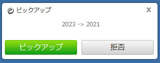 ピックアップのタブからピックアップボタンをクリックすることで代理応答することもできますが、代理応答可能な電話機の着信をポップアップで知らせ、そのポップアップにピックアップボタンを追加することもできます。次の例で、2023 は発信元、2021 は着信中の電話番号です。