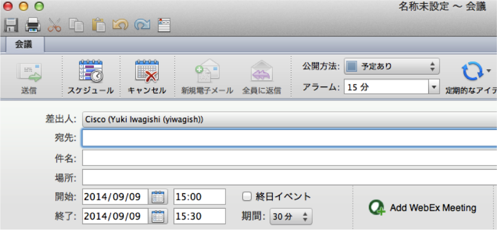 Outlook で簡単に Web 会議が予約できる生産性向上ツールが、 Windows 版に加え、 Mac OS 版にも提供されています。Mac OS で Outlook をお使いの方は会議をスケジュールするときに、 Add WebEx Meeting をクリックするだけで Web 会議を付け加えることができます。