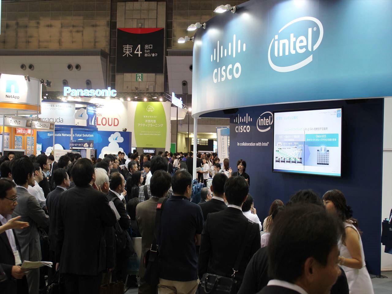 ご存知の方も多いと思いますが、ITpro EXPO は、シスコが最も強い「ネットワーク」よりも、むしろアプリケーションやクラウドというような比較的「レイヤの高い」出展や展示の多いイベントです。今回シスコはインテルからの支援を得て、データセンター ソリューション、特にシスコのサーバ「Cisco Unified Computing System(UCS)」を使ったソリューション (=使い方) をご紹介しました。