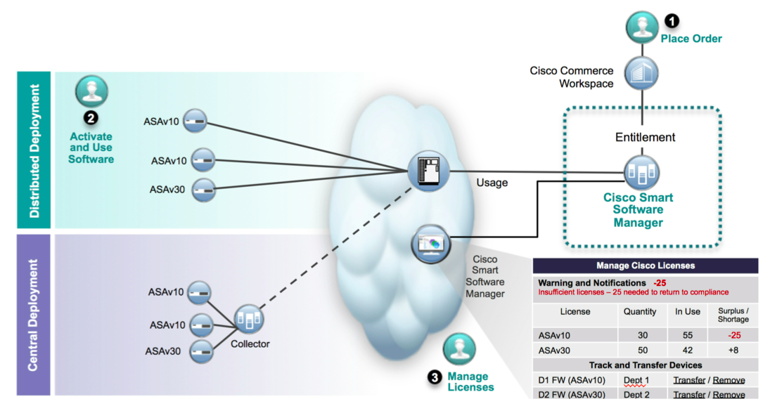 ライセンスについては、新しい Smart Licensing popup_iconというサービスが適用されます。ASAv が直接、あるいは Proxy サーバ経由で、インターネットを介してシスコが提供するスマートライセンスマネージャにアクセスします。(ちなみにこの仕組みは、Smart Call Home の機能を使っています。) 管理者は、スマートライセンスのポータルサイトから、プールしている購入済みライセンスを ASAv のインスタンスに適用します。この結果、ライセンスの一元管理が可能になります。また、ASAv5 では、この Smart Licensing の仕組みを使って、サービス プロバイダーのお客様向けに、利用した ASAv のライセンスの月額を後払いできるモデルも提供されます。