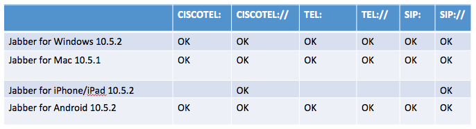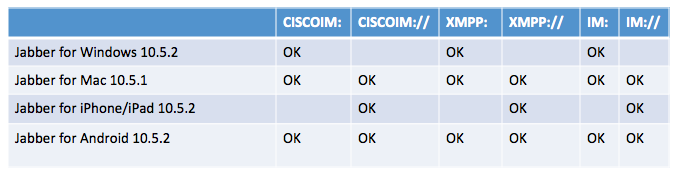 Cisco Jabber のチャット機能の呼び出しには、これ以外にも XMPP や IM を利用できますが、こちらも実装による違いがあります。以下は 2014年12月現在の実装状況です。