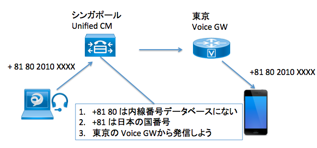 国をまたがるさまざまな番号体系に対応できるのが Cisco Unified Communications Manager のメリットとなります。また、 今まで通り0 発信や短い内線電話番号形式での発信にも対応していますので、どこにいるか、どんな種類の電話を利用しているかを意識することなく、利用者は同じ使い勝手で電話をかけることができます。クリックツーコールに限らず、LDAP / Active Directory での番号体系をシンプルにするには E.164 で番号体系での表現が解の一つになります。