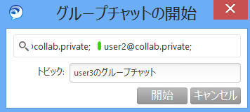 またチャット(グループチャット)の場合も、セミコロンで区切って複数のユーザを指定します。たとえば user1@collab.private と user2@collab.private とでグループチャットを開始するには、user1@collab.private;user2@collab.private と記述します。