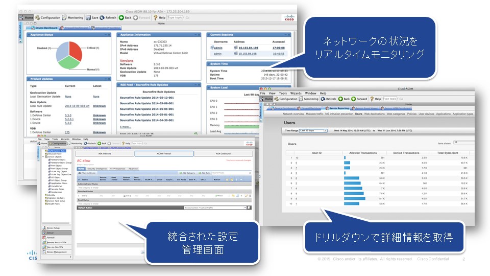 運用管理も、上位機種と同様のシンプルかつ統合された設定管理で、効果的にネットワークを保護できます。さらに今回の新製品リリースに伴って、無償で提供される 管理コンソール「Cisco ASA Device Manager(ASDM)」の機能も拡張されました。ベーシックな ASA ファイアウォールや VPN 機能に加え、FirePOWER Services モジュールの各種機能の設定および管理が簡単に行えるようになっています。