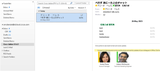 Outlook の Inbox に Cisco Jabber チャットというフォルダが追加され、チャットの相手別に履歴を確認することができます。これにより確認が必要な事項をメールで会話をしたのか Jabber で会話をしたのか忘れてしまったとしても、同時に検索をかけて探し出すことが簡単にできます。