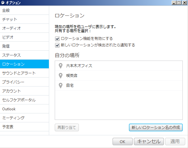 過去に入力したロケーション名一覧は設定オプションで確認可能です。また、 Cisco Jabber はログインした場所を検知し自動的にロケーションを変更します。