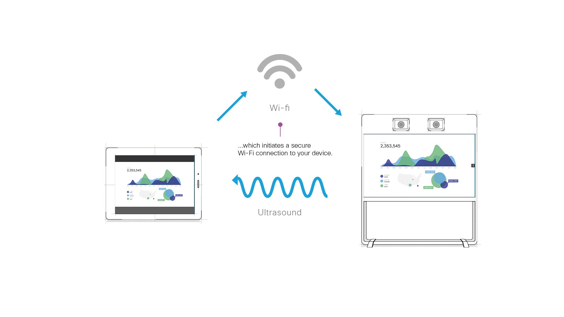Cisco Intelligent Proximity のソフトウェアは超音波で端末を探索し、実際は Wi-Fi 経由で HTTPS を使ってデータ通信を行います。音波は会議室の外には届きませんので、会議室の中にいて社内 Wi-Fi に接続できている会議参加者だけが資料表示・共有することができます。