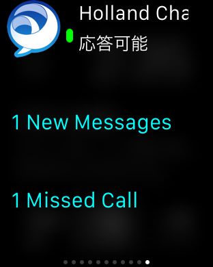 Apple Watch の文字盤の上で下から上へのスワイプすることで表示される「グランス ビュー」には、Cisco Jabber の未読メッセージや未応答着信、ステータスが表示されます。また、グランス ビュー の表示を 1回のタップするだけで、Cisco Jabber アプリを表示することができます。