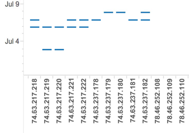 このグラフから Angler の傾向が一貫していることがわかります。Angler は今日利用可能な最も先進的なエクスプロイト キットの 1 つですが、インフラストラクチャの観点からは、その規模は大きくありません。それにもかかわらず、Angler は恐らくごく少数であろう顧客にして膨大な数のユーザを攻撃することが可能です。ここで興味深いのが、日によって IP が大きく変化することがない点です。Angler は、システムがユーザを攻撃する際、ある IP アドレス(74.63.217.218 など)から使い始め、攻撃者が隣接する IP アドレス(74.63.217.219 など)に移行するためのノイズを生成します。このアクティビティは、同一プロバイダーによって使用されている、連続する IP 空間ブロックにわたって継続されます。このことは攻撃者が複数のサーバを使用でき、ブロックされる都度、あるサーバから次のサーバへと移動していることを示しています。次のグラフはこうしたケースを示しており、時間の経過に伴い IP 空間が移行していることがわかります。