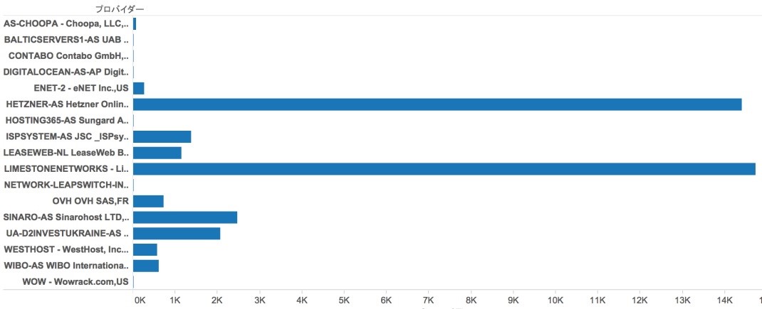 Talos は IP インフラストラクチャにまで範囲を広げ、Angler Exploit Kit を配信している ASN およびホスティング プロバイダーについて、徹底した調査を行いました。Talos がまず注目したのが、問題の IP 空間に関連付けられているプロバイダーごとのトラフィック量です。次のグラフはその結果を示しています。