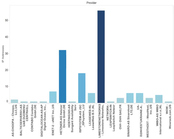 7 月中に観測されたユニーク ASN は総計 17 でした。そのうち 2 つの ASN(Hetzner 社および Limestone Networks 社)が、この月のトラフィック総量の 75 % 近くを占めていました。当初は、この 2 つのプロバイダーの両方が Angler 感染の大半に関与しているように思われました。しかしながらユニーク IP アドレスの数に基づきデータをグラフ化することで、新たな事実が浮かび上がってきました。