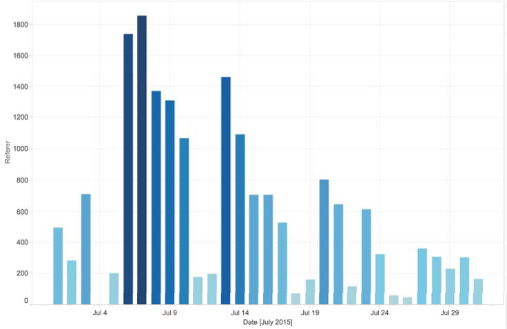 ユーザはエクスプロイト キットを直接ブラウズするだけでなく、悪意のある iFrame やマルバタイジングを介してエクスプロイト キットに誘導されます。いずれのケースも、調査を行った 1 ヵ月間で相当数が確認されました。Talos の観測によると、人気の高い Web サイト(多数の主要ニュース サイト、不動産サイト、ポップカルチャー サイトなど)が、マルバタイジングを介して、Angler Exploit Kit にユーザをリダイレクトしていました。さらに、アメリカの地方紙に載った個人の死亡記事など、一見するとランダムで小規模な無数の Web サイトが同様のリダイレクトを行っていることも確認しました。最も興味深い点は、ユニーク Referer 数とそれらが使用された頻度です。Talos はエクスプロイト キットに人々を誘導するユニーク サイトを 15,000 以上発見しましたが、その 99.8 % が 10 回未満しか使われておらず、使用頻度の低さが明らかになりました。このことは、Referer の大半は短期間だけアクティブで、少数のユーザが攻撃対象となった後で削除されていることを意味しています。この点は Angler の追跡を非常に難しくしている特徴の 1 つです。次のグラフは、Talos によって 7 月中に観測されたユニーク Referer を示したものです。分析を通じて Talos は、アクティビティのピークがさまざまな「Hacking Team」ゼロデイ(CVE-2015-5119popup_iconCVE-2015-5122popup_icon)エクスプロイトに関係していることを確認しました。