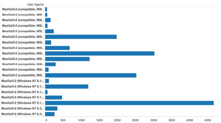 このデータと、Talos が観測した Angler を配信しているサーバの 1 日あたりの総数を組み合わせることで、侵害されているユーザの範囲をより正確に見積もることが可能になります。もう 1 つの注目すべき点は、ターゲットとされている Web ブラウザです。Angler が主として Internet Explorer をターゲットにしていることは予想どおりで、大多数の侵害が Windows 7 または Windows 8.1 上で実行されている Internet Explorer 11 で発生していました。