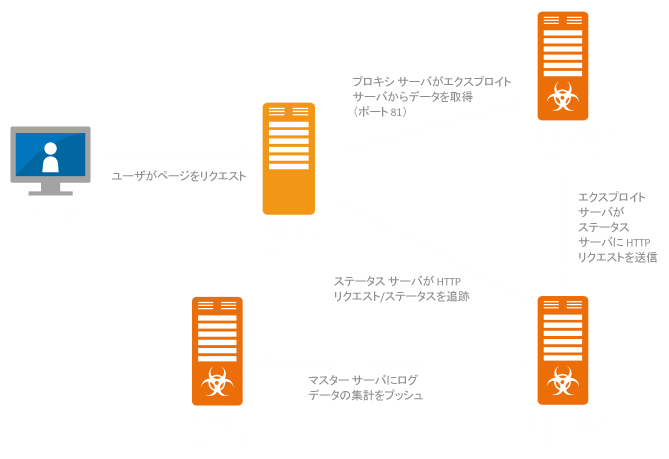 Angler は、実際にはプロキシ/サーバ構成ではありません。エクスプロイト サーバは 1 つで、このサーバが複数のプロキシ サーバを通じて悪意のあるアクティビティを実行する役割を担っています。プロキシ サーバは、ユーザとの通信を行うシステムで、エクスプロイト サーバが特定および公開されないように保護しながら、攻撃者がすばやく入れ替われるようになっています。また、ヘルス チェックを行うヘルス モニタリング サーバがあり、乗っ取られて悪用されているホストの情報を収集し、ログ ファイルが収集されそうになるとリモートで消去します。このヘルス サーバにより、キャンペーンの範囲と規模が明らかになり、アクティビティを金額に換算できるようになりました。